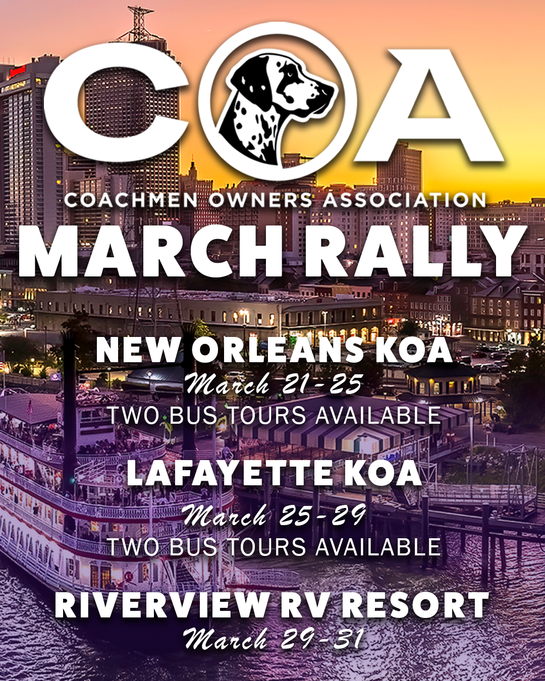 Membership with the COA allows you the opportunity to participate in trips, tours and rallies coordinated for you at discounted rates, monthly, discounts on purchases through PETE’S MARKET— Coachmen’s very own storefront for Coachmen apparel and accessories, convenient and affordable mail forwarding service, and access to local and state club activities, as well as a dedicated COA web site and Facebook to keep up on current events, news, and happenings within the COA. Additional benefits, services, and discounts are constantly being added to enhance your COA membership so make sure you check our Membership page often!